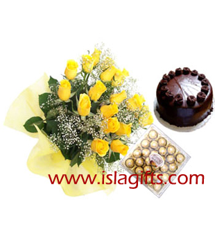 Bunch of 24 Stems of Yellow Roses 1/2 Kg Chocolate Cake & Ferrero Rocher ( 24 Pcs ) Box.